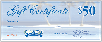 Boat lettering is a truly unique and special gift for any boat owner. Cap'n John's Gift Certificates are available in $25, $50, $75 and $100 amounts.